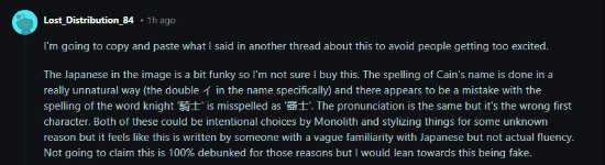 然而,海外玩家对该爆料的真实性普遍持怀疑态度。有玩家指出,爆料图中使用的日语表述存在明显问题:例如男主角名字的拼写方式生硬,且「騎士」被错写成了同音但含义错误的「器士」。整体行文风格显示出作者对日语有一定了解,但并未达到流利水准,更像是由非母语者或机器生成的文本。