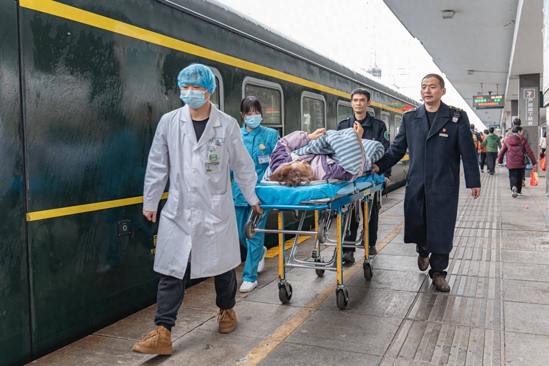 “慢一点,注意平稳!”转运途中,周光明一边轻声提醒,一边全程随行护送。在众人合力下,担架平稳穿过车厢,缓缓步出列车。